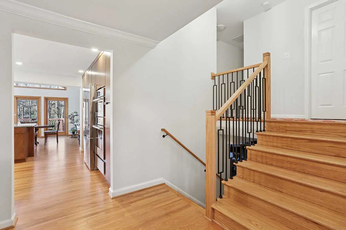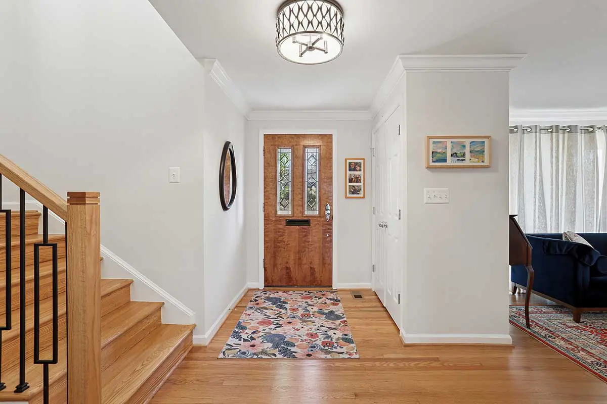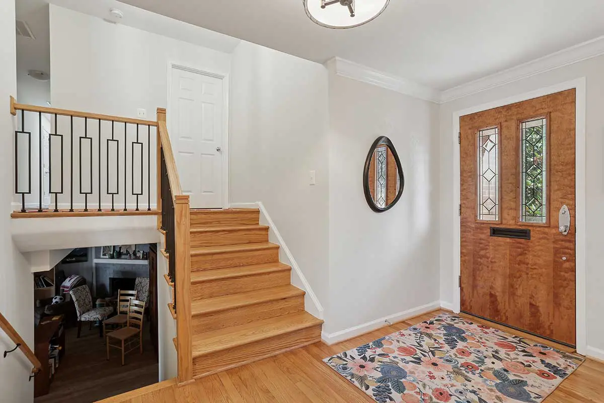 In the foyer, we reconfigured the entry closets by combining them into one and pushing the new closet back to create more space. We also updated the hand railings to complement the refreshed entryway.