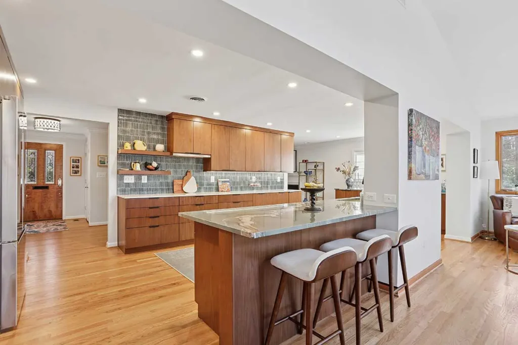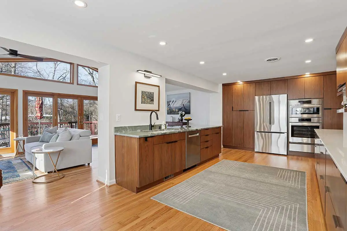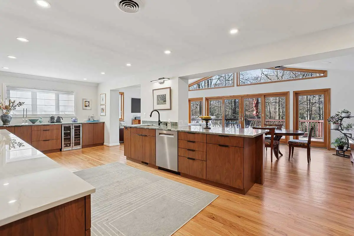 The completed renovation transformed this Falls Church home into a more open, functional, and beautifully refined living environment tailored to the homeowners’ next chapter as empty nesters. The once-tight and dated kitchen now feels spacious and purposeful, with improved sightlines, dramatically expanded storage, and high-end materials that bring a fresh, modern warmth to the main level. The reconfigured layout allows the kitchen, formal living room, and family room/eat-in area to flow naturally together while maintaining the home’s original character.