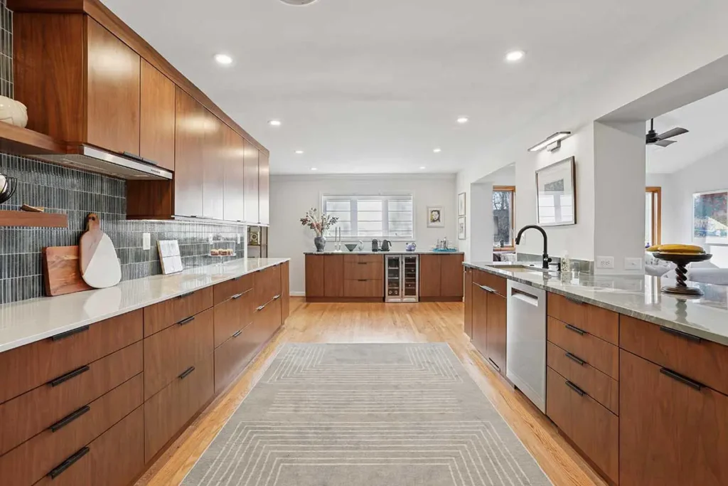 In the area that once served as the formal dining space, we added a new dry bar with an undercounter refrigerator and additional surface space, finished in the same Persian Maestro Quartzite to create a cohesive, luxurious look throughout the kitchen.