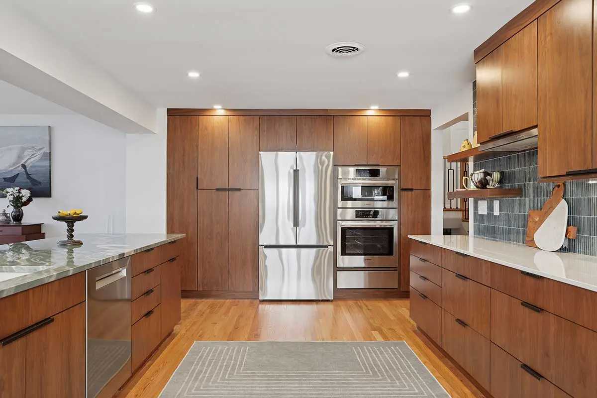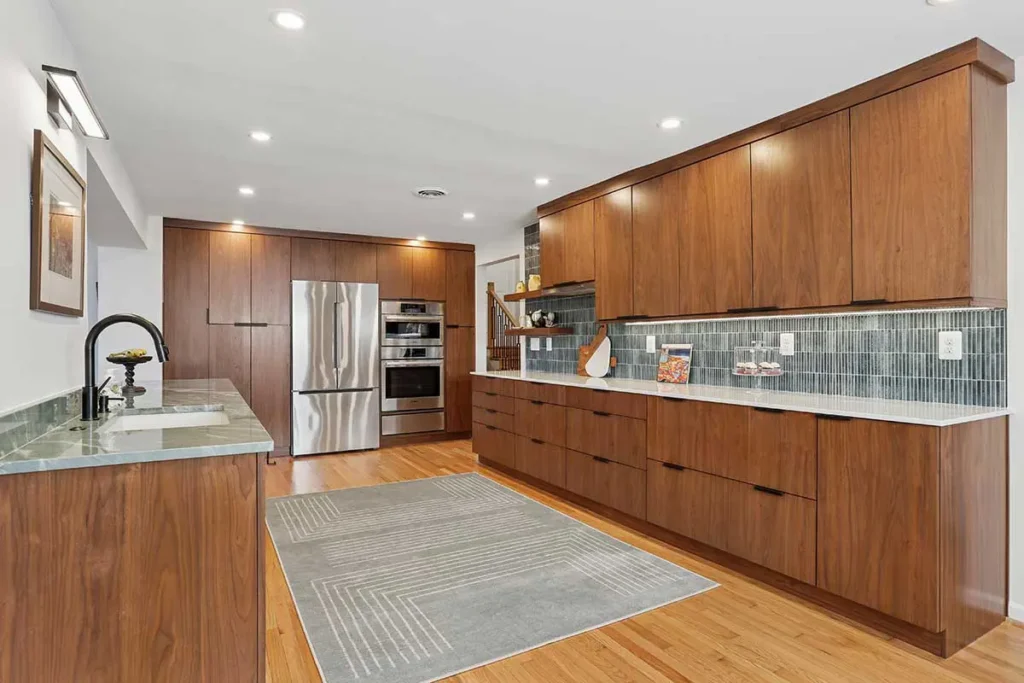 All cabinetry is from St. Martin Cabinetry, featuring a walnut stain on slab-style Clayton doors for a clean, modern aesthetic. Additional design details include matte black plumbing fixtures, an air switch for the garbage disposal, and a thoughtful combination of recessed and undercabinet lighting.