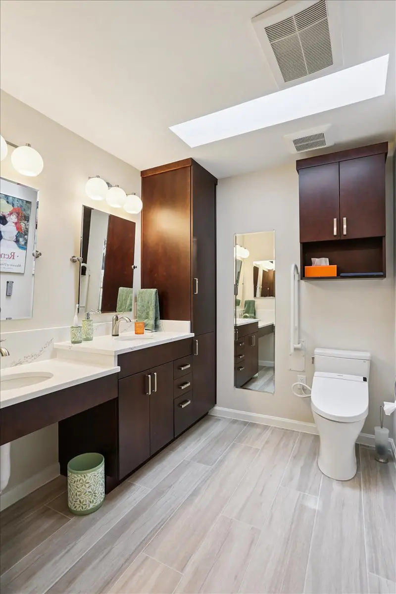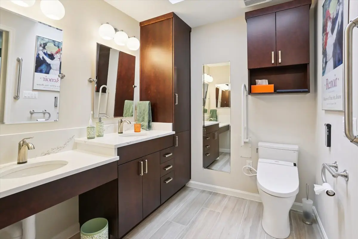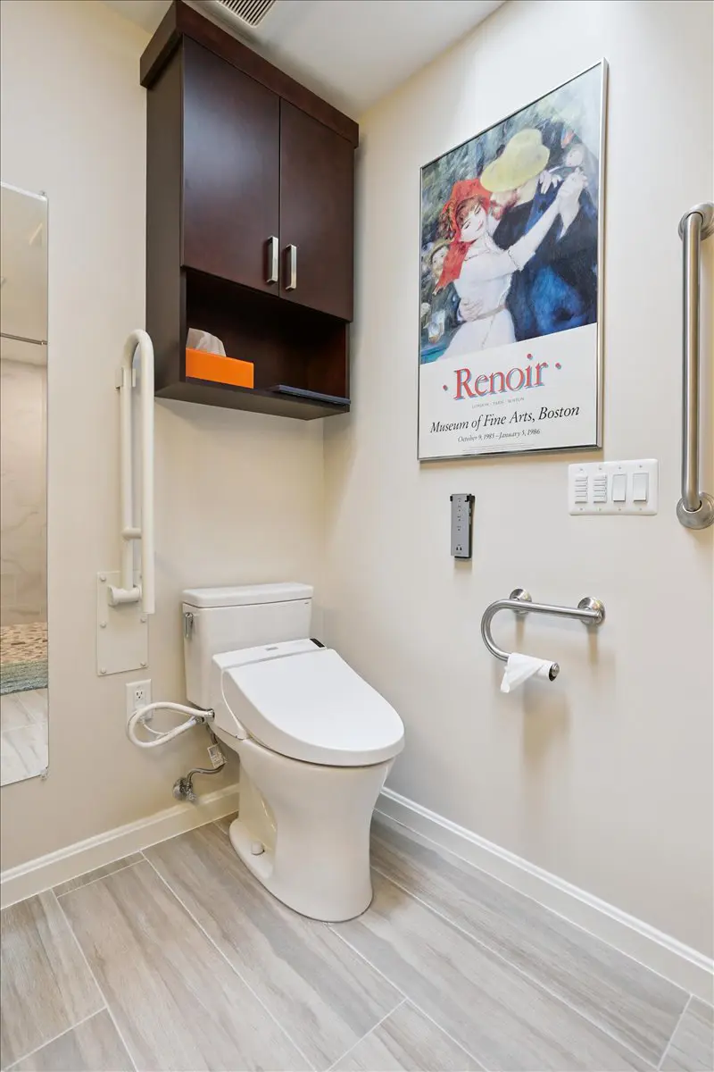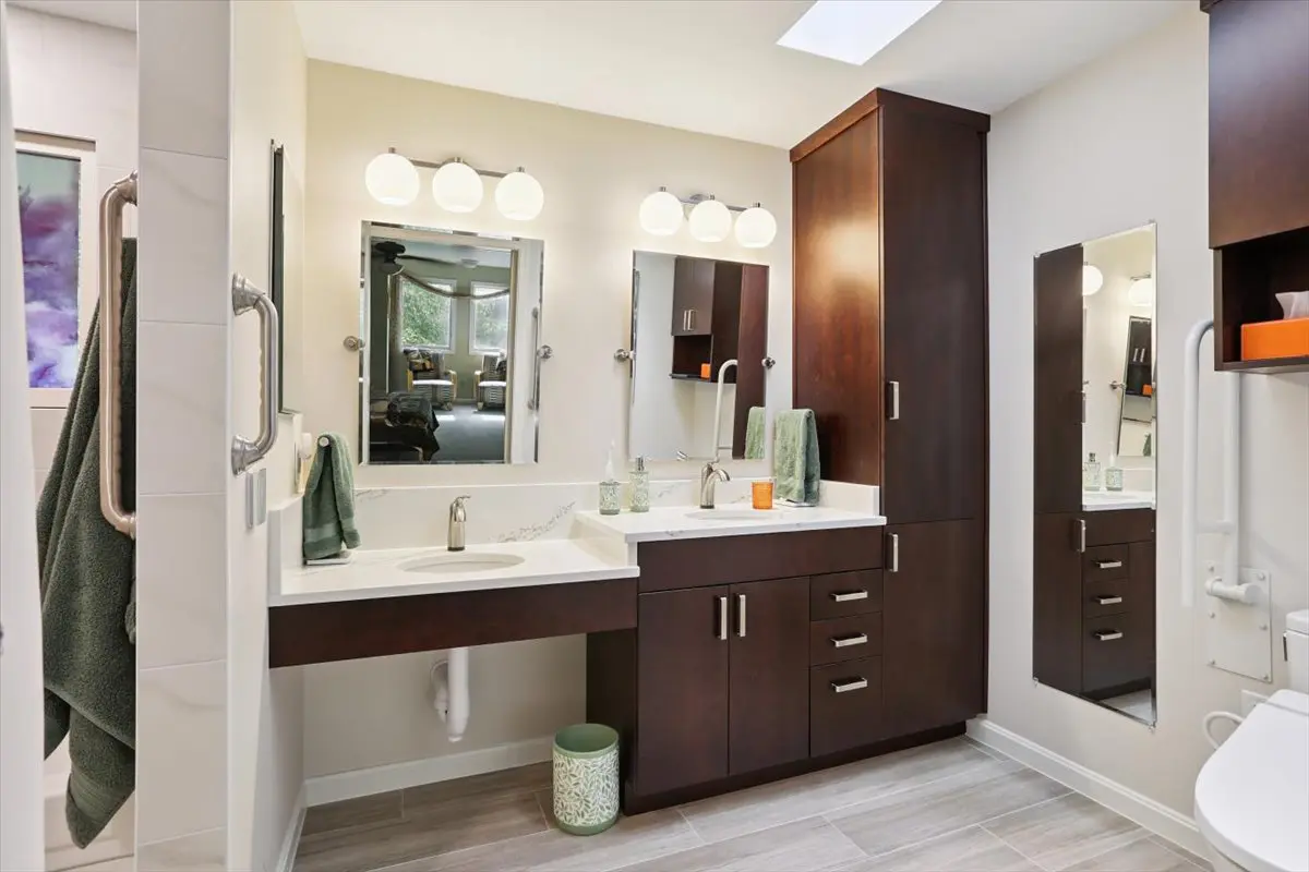 To improve accessibility, the team widened the doorways to both the bedroom and bathroom, added grab bars, and ensured the toilet and lavatory sink could be easily used with a walker or wheelchair. The floating vanity, topped with durable quartz countertops, combines function and beauty, while custom Wellborn cabinetry provides smart storage solutions—including a 12-inch cabinet above the toilet and a convenient linen closet.