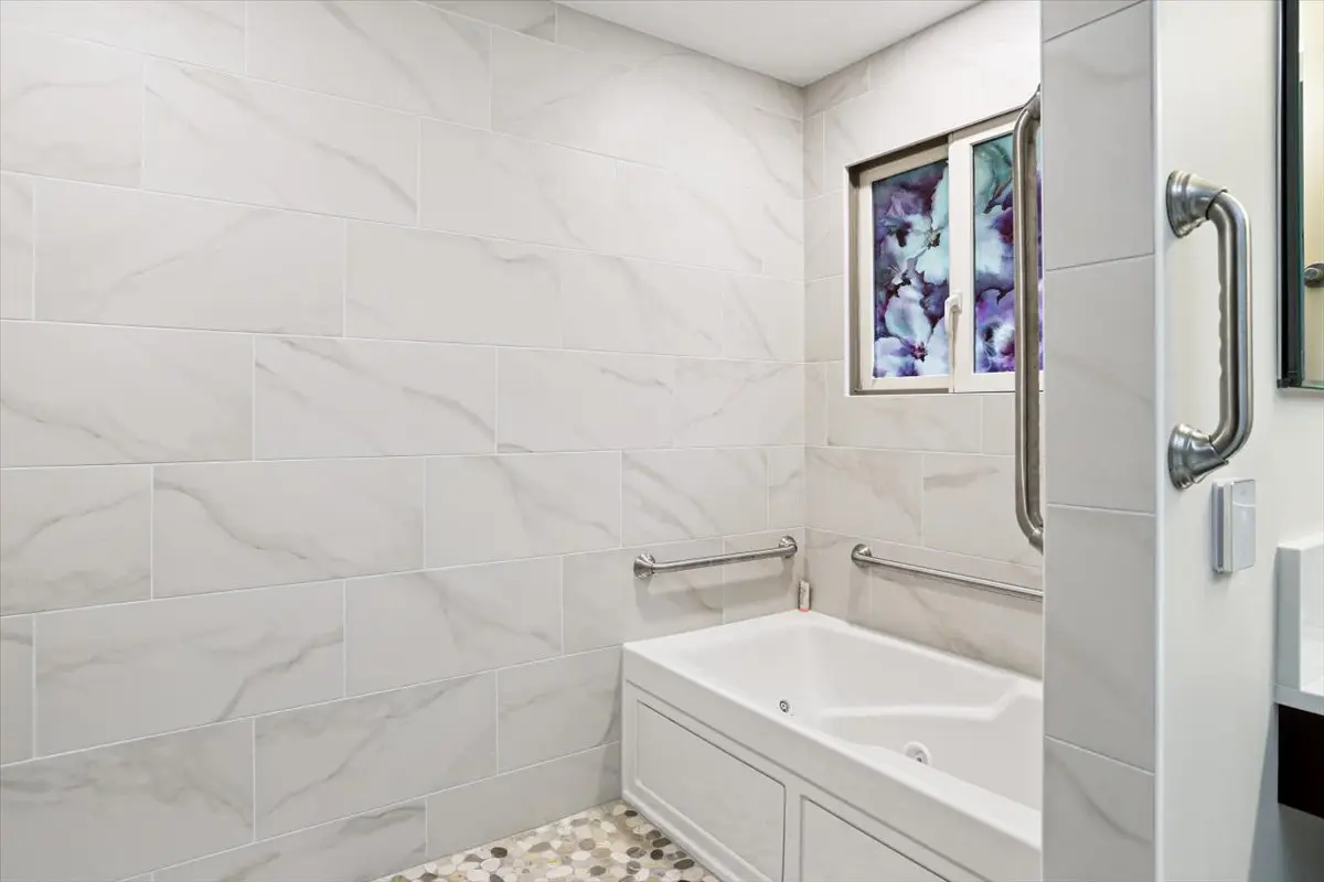 Schroeder Design Build removed several walls to open up the room and create a seamless curbless shower within a complete wet room design—an elegant and functional solution that blends safety with style. The homeowner enjoyed using the jetted tub, so it was thoughtfully integrated into the new layout alongside upgraded heated floors for added comfort and luxury.